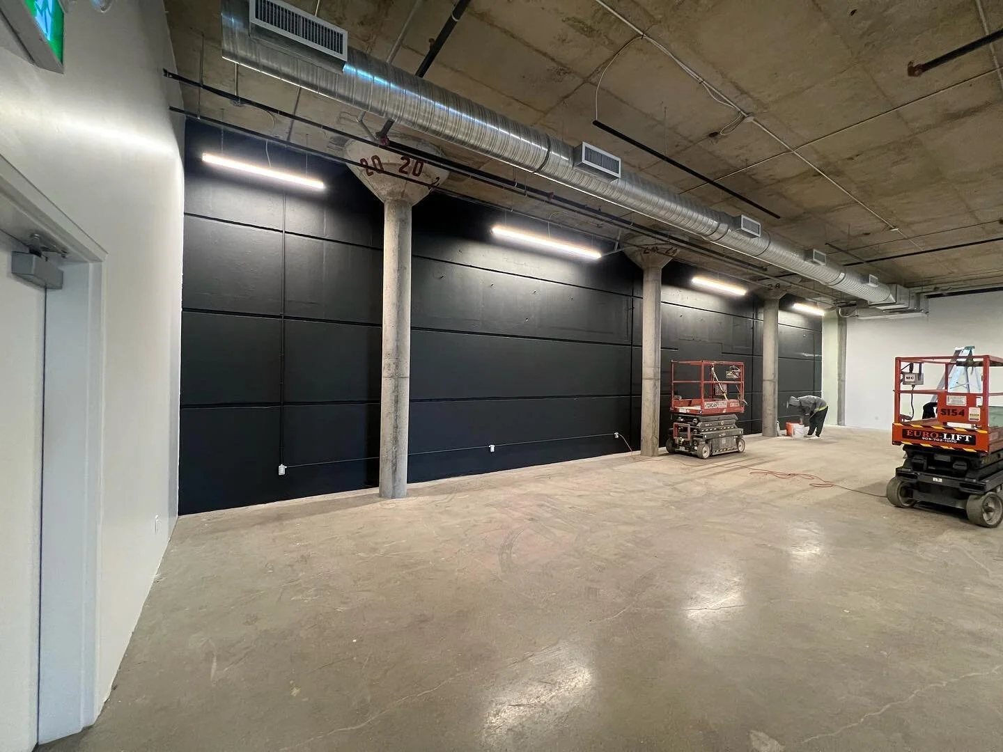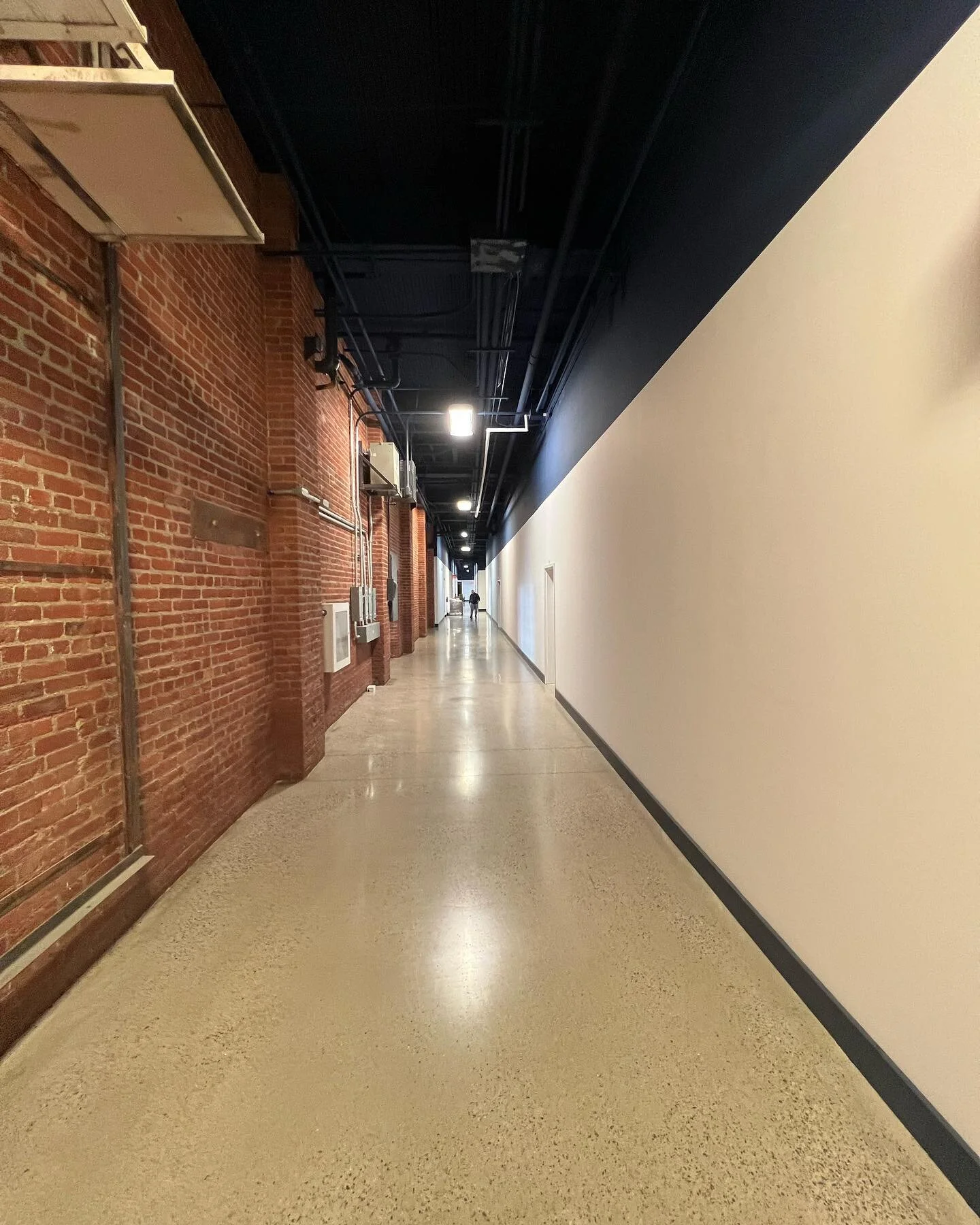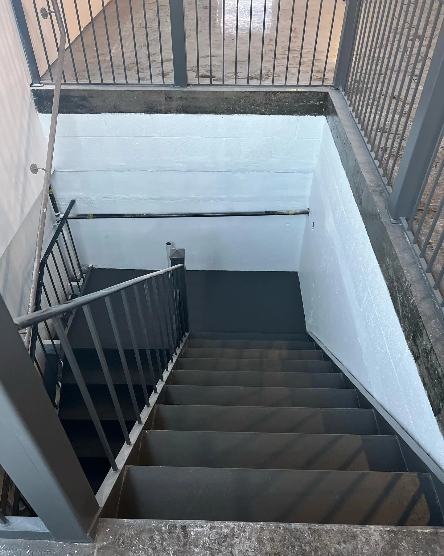 10,000 sq ft of commercial space. Our client wanted to brighten up the space. Painted the metal deck and posts white. Swipe for the before(s)